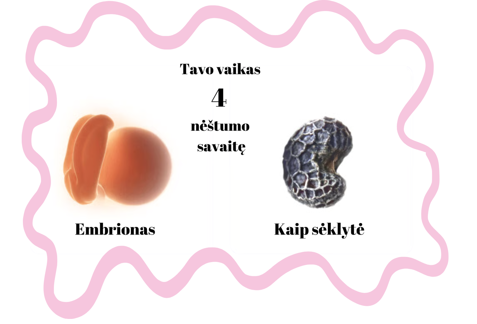 Šiuo laikotarpiu apvaisintas embrionas įsitvirtina gimdos sienelėje ir pradeda vystytis. Pradeda formuotis stuburas ir smegenys, taip pat ankstyvas amniono maišas (apsauginis sluoksnis, supantis kūdikį gimdoje) ir virkštelė (struktūra, kuri perduoda maistines medžiagas ir deguonį iš jūsų kūno kūdikiui).